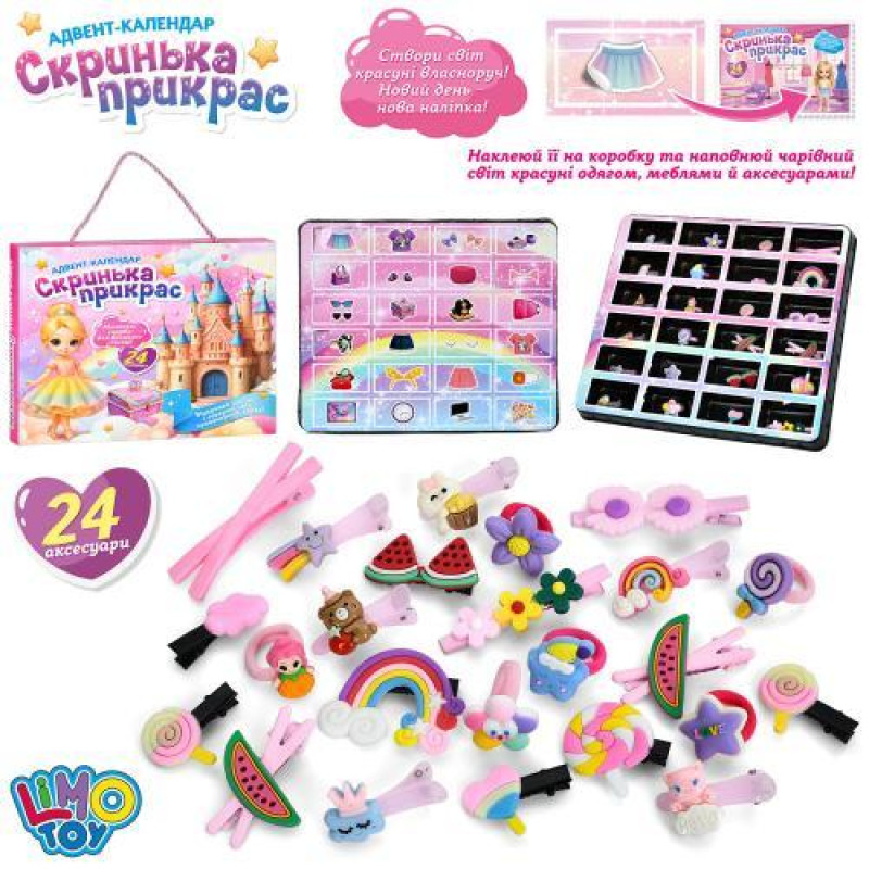 Этот волшебный набор-сюрприз Адвент-календарь дарит ребенку ежедневную радость открывать новые аксессуары. В шкатулке найдется широкий выбор заколок – от классических «крабиков» и невидимок до блестящих украшений с разнообразными узорами. Комплект также содержит мягкие и прочные резинки для волос и ..