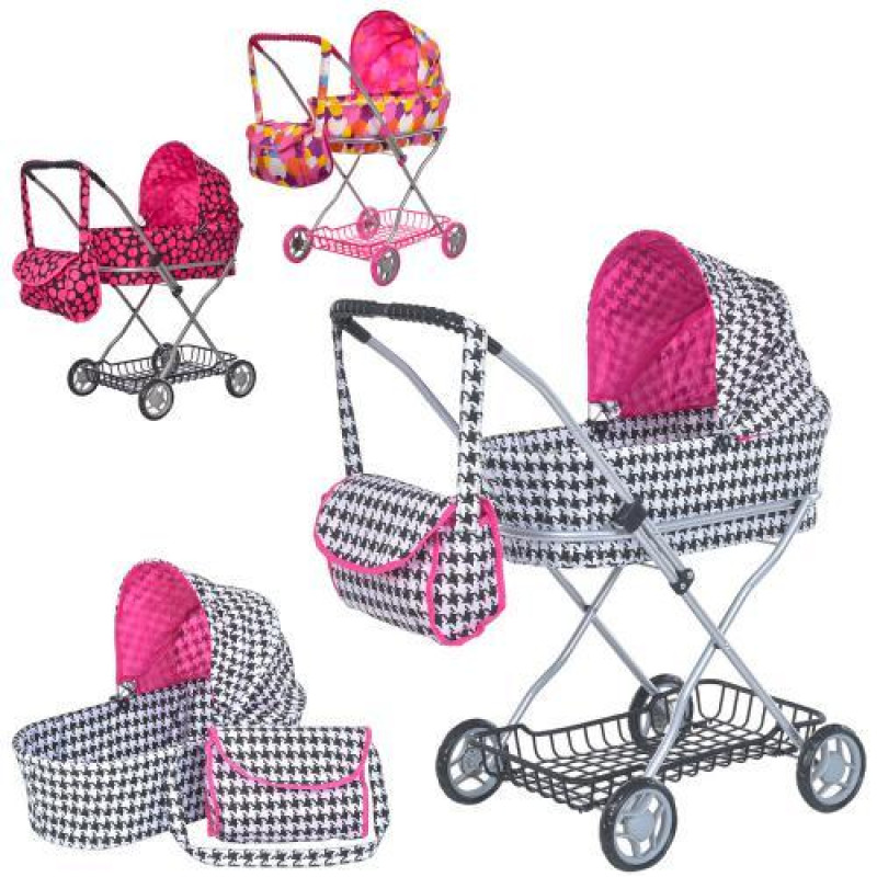 - коляска-люлька классическая. Может идти в комплекте с сумкой-переноской, корзиной для игрушек, матрасиком, чехлом. В зависимости от модели игрушечная коляска-люлька может иметь регулируемую ручку, подвижный капюшон-козырек;