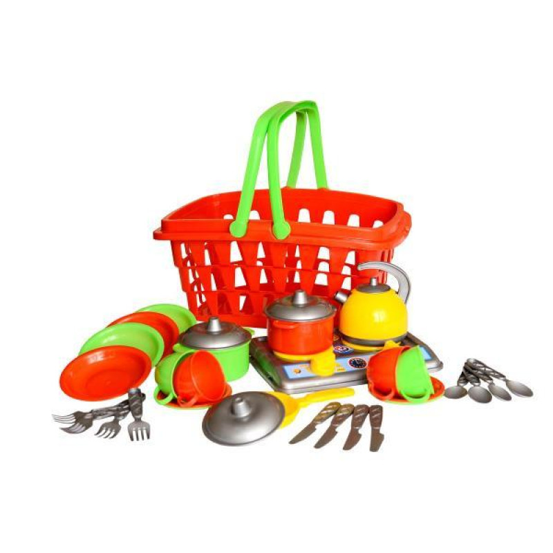 Игровой Набор посуды в корзинке. Во время игры с игрушечной посудой, муляжами продуктов питания, используя столовые приборы, кухонные принадлежности, дети познают окружающий мир, осваивают социальные роли, привыкают к ответственности. Эта яркая функциональная игрушка придется по вкусу любой маленько..