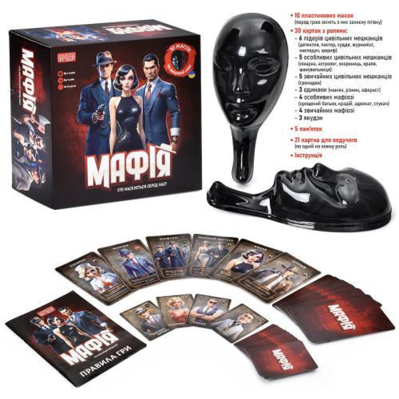 Настольная игра Мафия, маска 10шт 35,5*15*9см, карты 30шт, карты для ведущего 21шт, от 6-ти игроков, в корр. 30*30*14см арт: AI001..