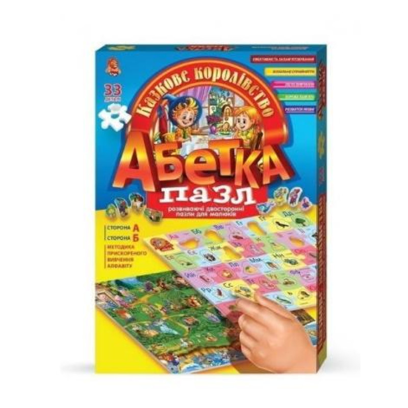 Азбука-пазл "Сказочное королевство". С одной стороны картинка складывается в сказочное королевство со всевозможными сказочными героями, с другой стороны - каждый элемент соответствует определенной букве алфавита и складывается в общую картинку...