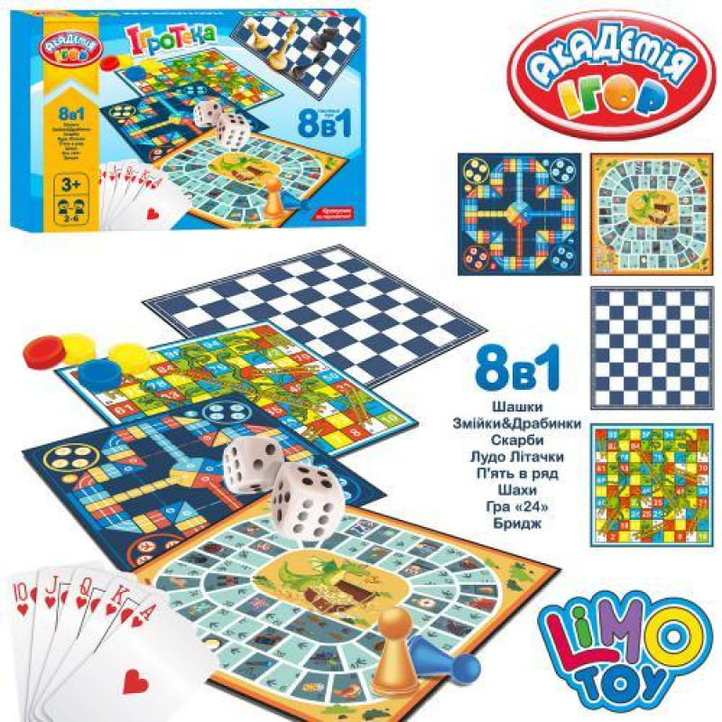Настольная игра 8в1, LIMO TOY шашки, шахматы, фишки, кубик, карты, игровое поле, в кор, 38*25*5,5см..