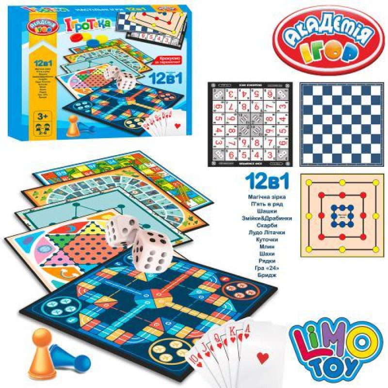 Настольная игра 12в1, LIMO TOY шашки, шахматы, фишки, кубик, карты, игровое поле, в кор. 38*33*5,5см..