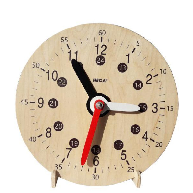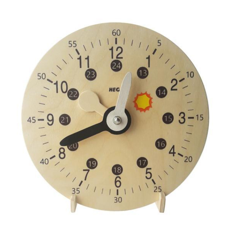 Учебная модель механических часов, настольная (24 часа, часовая и минутная стрелки, подвижные изображения дня и ночи) Часовой циферблат изготовлен из древесины, имеет две подвижные цветные стрелки (часовая и минутная). Цена деления шкалы циферблата – 1мин. Час обозначен арабскими цифрами, при ..