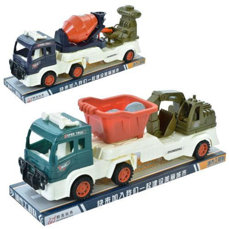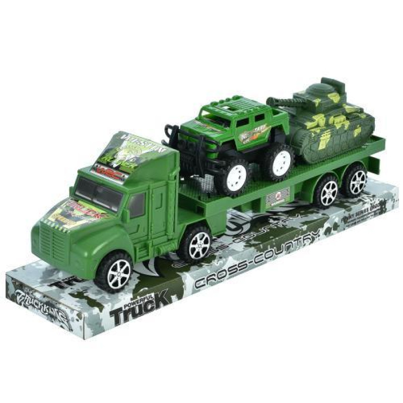 Военный трейлер с инерционным механизмом — увлекательная игрушка для детей от 3 лет, которые интересуются техникой и сюжетными играми. Длинный трейлер размером 34см легко приводится в движение благодаря инерции и перевозит в комплекте два военных транспортных средства — джип и танк длиной по 10см ка..