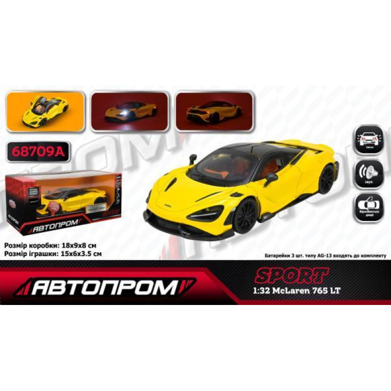 Машина мет. АВТОПРОМ 1:3 "McLaren 765 LT", батарейки, звук, открывается дверь, в коробке..