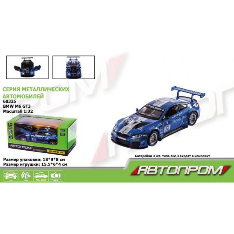 Металлическая машинка - уменьшенная копия настоящего автомобиля. Предназначена для игры в доме и на улице. Для детей старше 3-х лет. Основные характеристики: Машинка металлическая "АВТОПРОМ", 1:32 BMW M6 GT3 , тип питания: на батарейках, свет, звук, открываются двери, упаковка: коробка 18*9*8см..