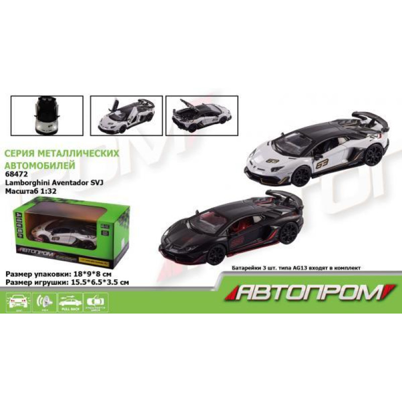 Металлическая машинка - уменьшенная копия настоящего автомобиля. Предназначена для игры в доме и на улице. Для детей старше 3-х лет. Основные характеристики: Машина металлическая "АВТОПРОМ", 2 цвета, 1:32 Lamborghini Aventador SVJ, тип питания: на батарейках, свет, звук, откр.двери, упаковка: короб..