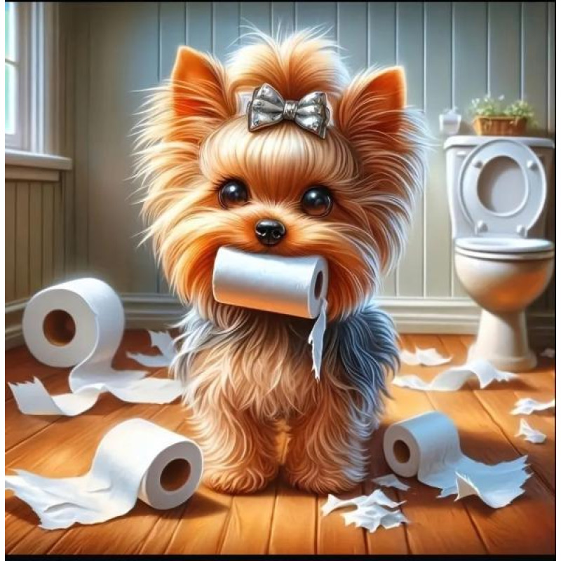Алмазная мозаика «Вредный йорк» – это забавная и живая картина, которая поднимает настроение. Маленький йоркширский терьер стоит посреди ванной комнаты, а вокруг него хаос: разорванная и разбросанная туалетная бумага. Его глазки-пуговки смотрят так невинно, будто он вовсе не виноват в проделке.Принц..