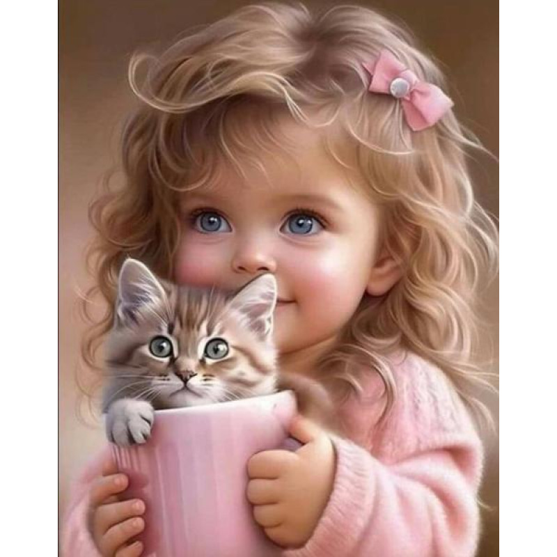 Алмазная мозаика «Девочка с котиком», 20*20см, на рамке..