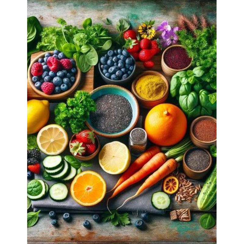 Алмазная мозаика «Композиция для детокса» – это яркий и вдохновляющий набор для творчества, который символизирует баланс, свежесть и заботу о себе. На картине изображена гармоничная композиция из свежих фруктов, ягод, овощей, зелени и семян, выполненная в насыщенных природных оттенках. Сюжет ассоции..