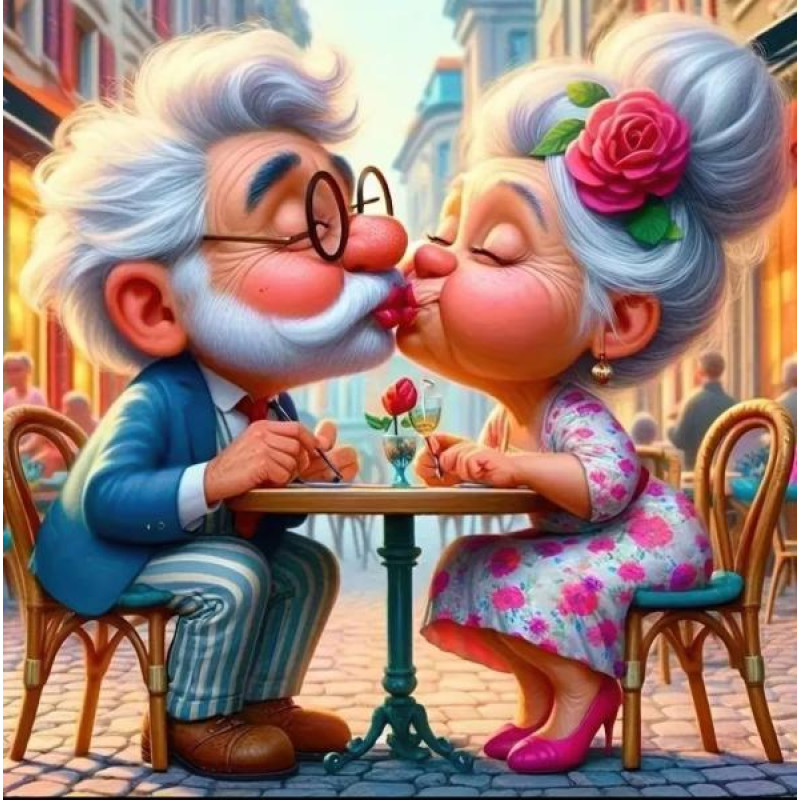 Алмазная мозаика «Клевая пара» – это теплая и юмористическая картина, которая дарит положительные эмоции всем возрастным категориям. На картине изображены стильно одетые дедушка и бабушка, которые сидят в кафе на улице и целуют друг друга. Это придает картине эмоциональности и трогательности.Принцип..