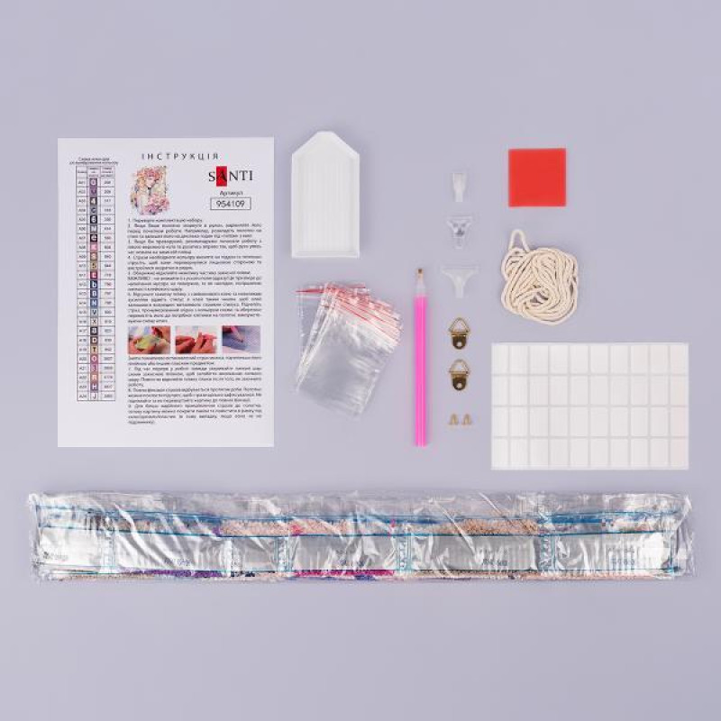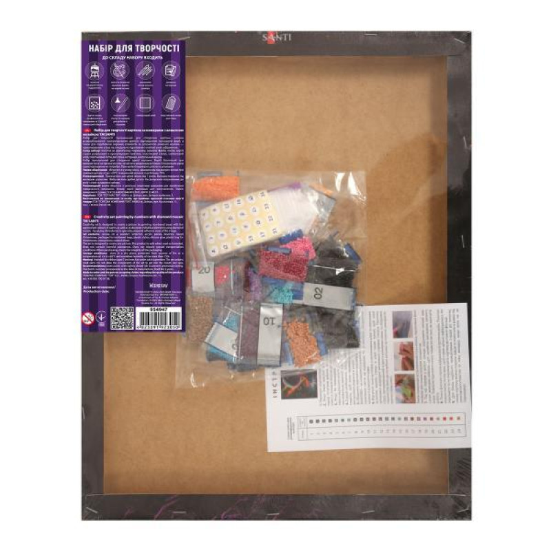Набор для творчества алмазная мозаика ТМ SANTI включает холст размером 40х50 см, уже натянутый на деревянный подрамник с нанесенной на него цветной схемой. Схема пронумерована, каждая цифра соответствует определенному цвету алмазного страза. Холст имеет специальный клеевой слой, который покрыт защитной пленкой. Когда вы отклеиваете часть пленки, клейкая поверхность становится доступной. В наборе идут маленькие, граненые акриловые камни (стразы) разных цветов. Для работы используются специальные инструменты: стилус (карандаш) с его помощью удобно захватывать стразы; пластиковый лоток для удобного хранения и сортировки стразов по цветам; силиконовый клей/воск используется со стилусом для легкого прилипания страз.
