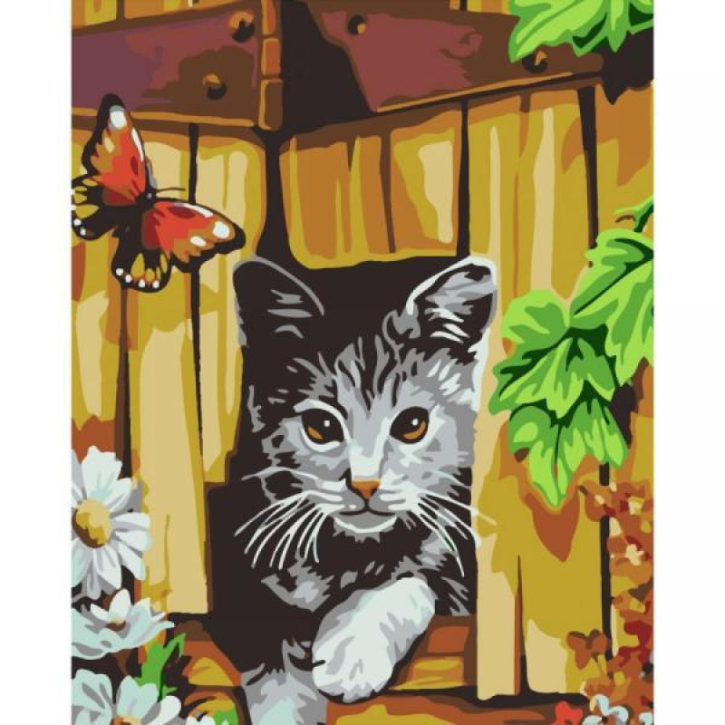 Картина по номерам Животные. Котик и бабочка возле забора, , 30х40см, в термопакете, Strateg (SS-6451-mt)