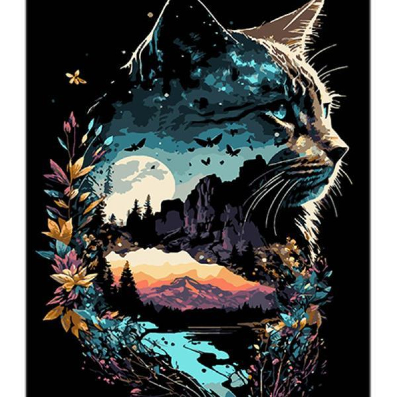 Набор для росписи на холсте Картина по номерам Животные. Кошка в двойной экспозиции, черный фон, 40х50см, в термопакете, Strateg (AH1128-mt). Комплектация: Холст на подрамнике, Акриловые краски, Кисточки разной толщины, Контрольный лист, Крепление. Количество цветов:. Уровень сложности:. Упаковка: в..