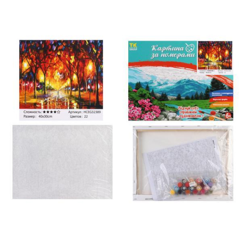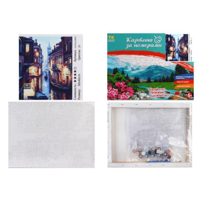Набор для росписи на холсте Картина по номерам МИКС. , 30х40см, в коробке, TK Group (32389-mt). Комплектация: Холст на подрамнике, Акриловые краски, Кисточки разной толщины, Контрольный лист, Крепление. Количество цветов: 20-36. Уровень сложности:. Упаковка: в коробке. Страна-производитель товара: К..