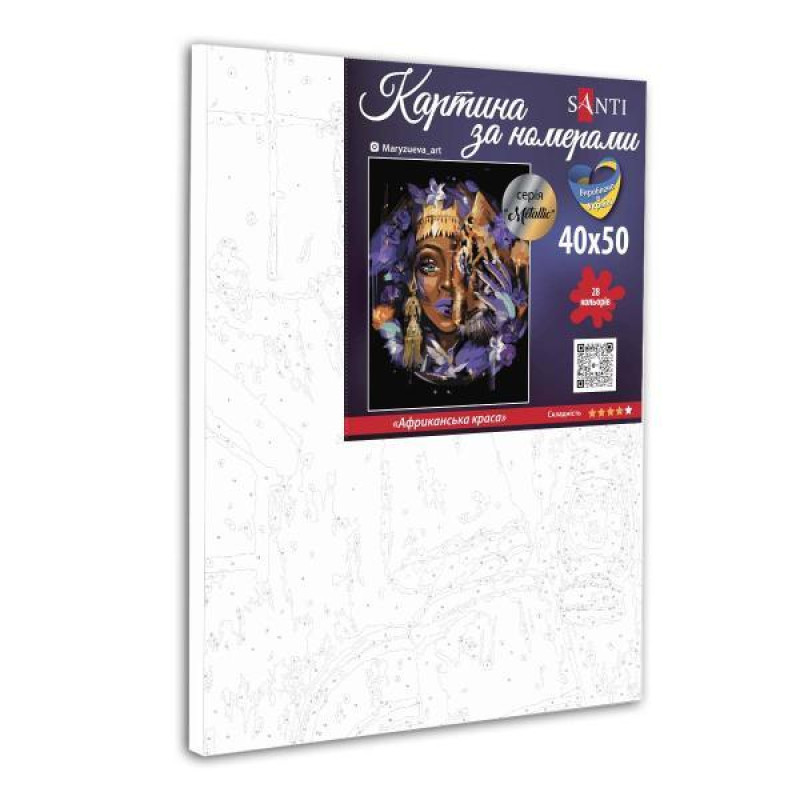 Набор для росписи на холсте Картина по номерам Люди. Африканская красота метал. краски , maryzueva_art , с красками металлик, 40х50 см, термопакет, SANTI (954726-tp). Комплектация: Холст на подрамнике, Акриловые краски, Кисточки разной толщины, Контрольный лист, Крепление. Количество цветов: 28. Уровень сложности: 4. Упаковка: термопакет. Страна-производитель товара: Украина