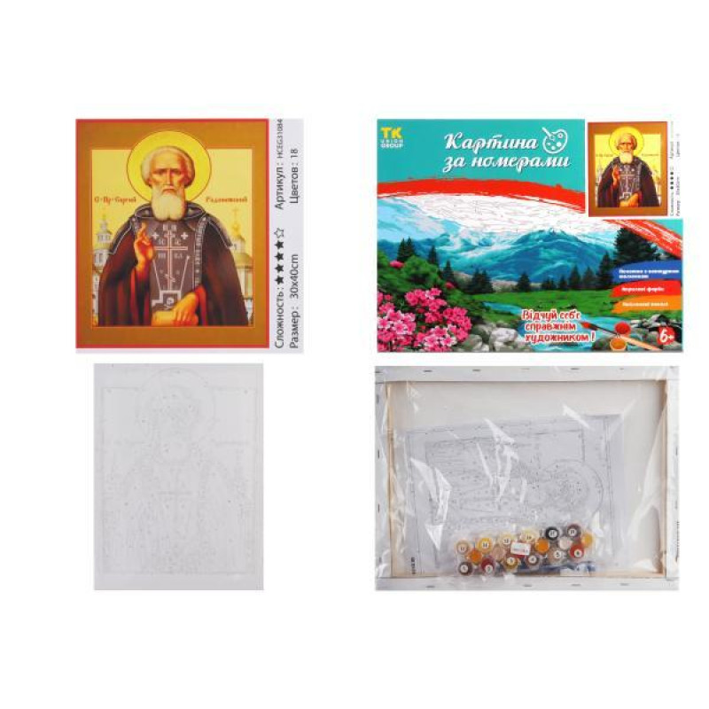 Набор для росписи на холсте Картина по номерам Религия. Икона Преподобный Сергей Радонежский, 30х40см, в коробке, TK Group (31084-mt). Комплектация: Холст на подрамнике, Акриловые краски, Кисточки разной толщины, Контрольный лист, Крепление. Количество цветов: 20-36. Уровень сложности:. Упаковка: в коробке. Страна-производитель товара: Китай