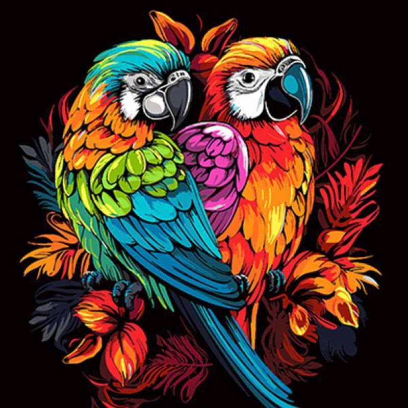 Картина по номерам Животные. Попугаи в цветочном поп-арте., черный фон, 40х40см, в термопакете, Strateg (AV4040-41-mt)