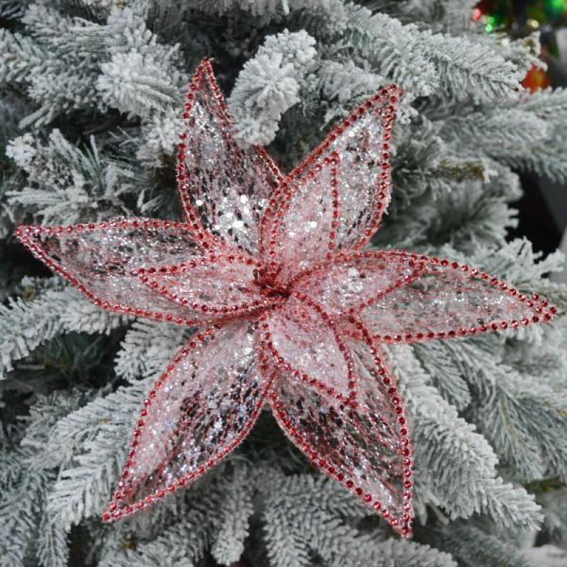 Пуансеттия – прекрасный и нежный цветок, который во многих странах является символом Рождества. Искусственная пуансеттия используется в декорировании новогодней хвои, в праздничных композициях, икебанах. Размер цветка: 24*24 см. Материал: ткань - газ, металлический клип.