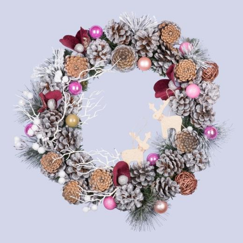 Стильный новогодний венок - прекрасное украшение интерьера к новогодним праздникам. Когда шишки тщательно и со вкусом украшают свои чешуйки свежим снегом и складываются в оригинальный ансамбль-венок - это смотрится сказочно мило. А когда к своему новогоднему наряду они добавляют нежно-розовые глянцевые шары, заснеженные ветки хвои и ягоды - с их обаянием уже ничто не сравнится!