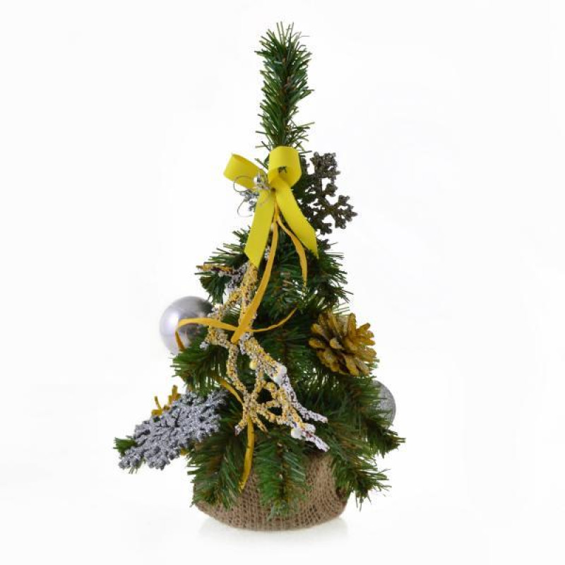 Маленькая компактная ель с яркими бантами и ветками, выполненными в одном цвете, а также с фанерной снежинкой, покрытой серебристым глиттером, станет прекрасным украшением помещения в период новогодних и рождественских праздников. Высота композиции: 25 см. Габариты: 0,25м.