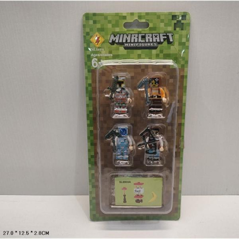 Набір мініфігурок за мотивами гри Minecraft включає чотири персонажі, кожен із яких тримає в руках інструмент — наприклад, кирку або меч. Фігурки виконані в характерному піксельному стилі, що відтворює атмосферу гри. Вони ідеально підходять для колекціонування або відтворення улюблених сцен з Minecr..