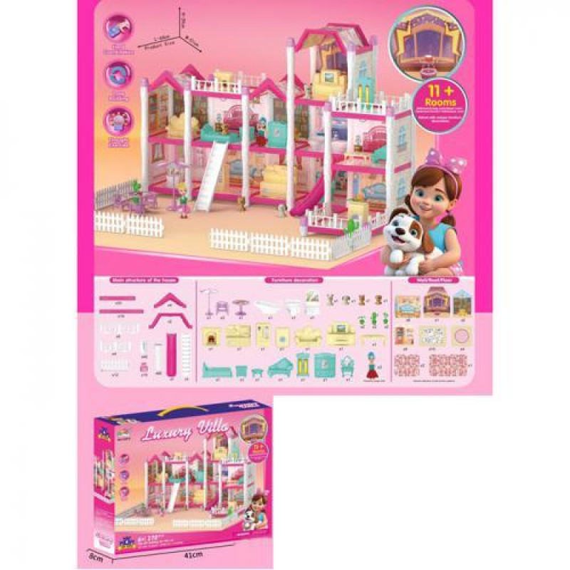 Будиночок 51*64*39см, 3 поверхи, меблі, лялька 2шт 10см, собачка 4шт, 282дет, в кор. 41*32*8см, ст: 1239-6