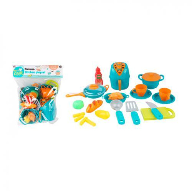 Набір посуду Cooking Set 9 предметів. Під час гри з іграшковим посудом, муляжами продуктів харчування, використовуючи столові прилади, кухонне приладдя, діти пізнають навколишній світ, освоюють соціальні ролі, звикають до відповідальності. Ця яскрава функціональна іграшка припаде до смаку будь-якій ..