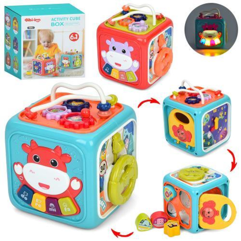Гра Куб, 13*15,5*12,5см, 6в1, піаніно, 4режими, музика(англ), звуки тварин, лабіринт на дроті, шестерні, кермо, сортер, 4 фігури, рухливі деталі, 2 кольори, на батар., в кор. 14,5*16*13,5см арт: 688-57