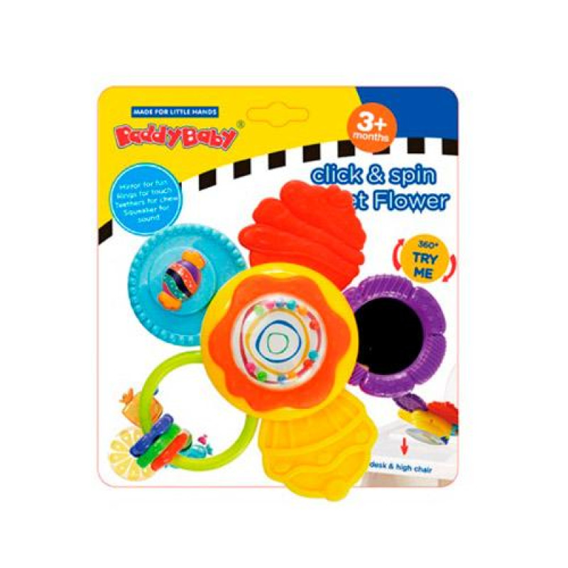Брязкальце «Квітка» на присосці, 15см - яскрава розвиваюча іграшка для найменших дослідників!Брязкальце у формі квітки з 5 різнокольоровими пелюстками, кожна з яких має цікаві елементи для гри: прорізувачі, люстерко, пищалку. У центрі розташована м’яка кнопка з кульками, яка видає кумедний звук при ..