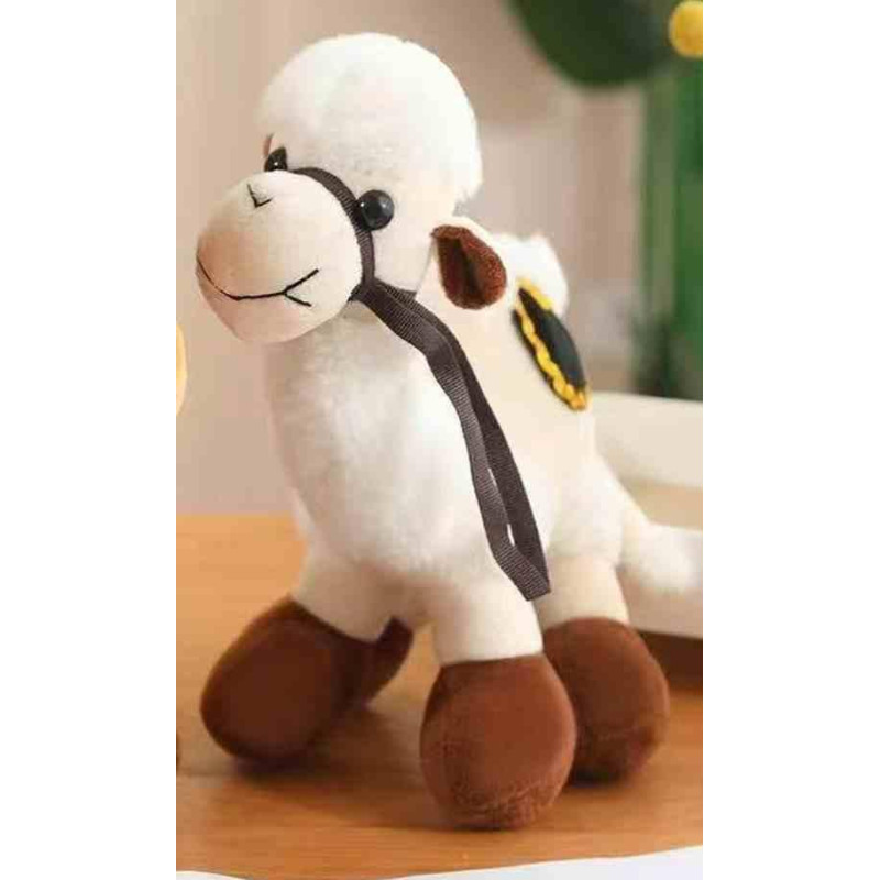 М’яка іграшка Верблюд – плюшева іграшка у вигляді верблюда з доброзичливим усміхненим обличчям, виконана у світлих відтінках. Корпус іграшки білого кольору з коричневими копитцями та вушками, декоративна збруя темного кольору доповнює образ. Матеріал м’який і приємний на дотик, іграшка добре тримає ..