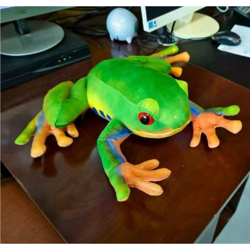 М’яка іграшка Жабка — яскрава плюшева іграшка у вигляді тропічної жаби з виразними очима та деталізованими лапками. Виконана у насичених зелених відтінках з контрастними жовто-помаранчевими лапами та декоративними кольоровими вставками, що надають іграшці реалістичного й водночас мультяшного вигляду..