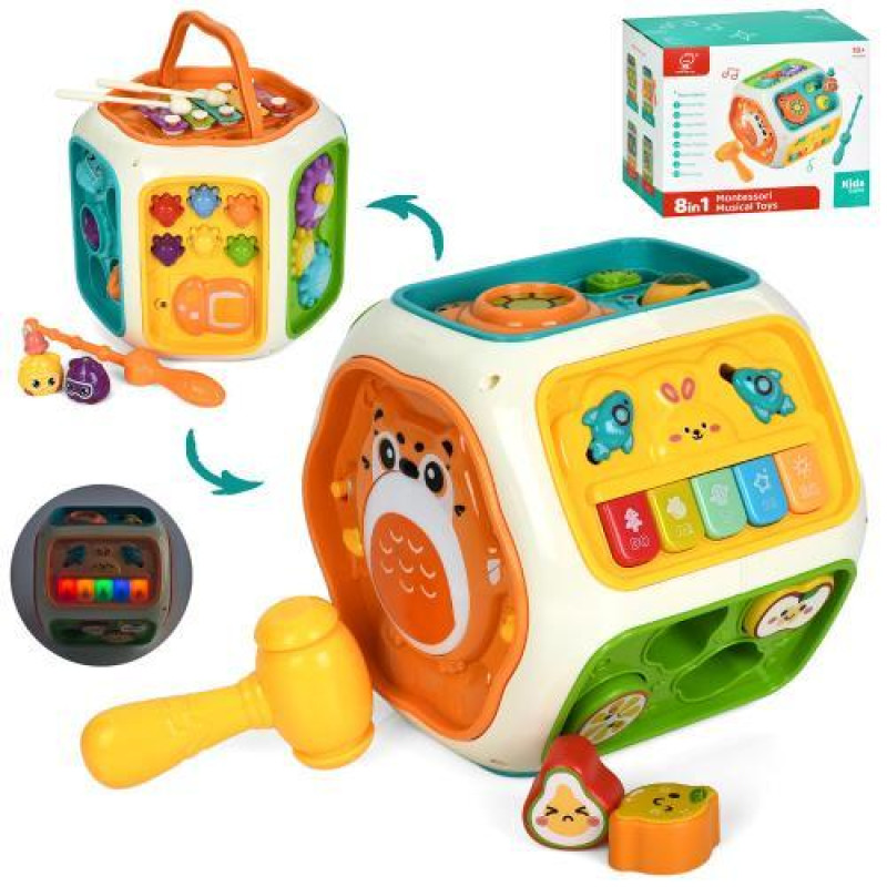Бізікуб, багатогранник, 17*18,5*18см, 8в1, музика, світло, риболовля , піаніно*5 тонів, барабан, молоток, шестерні, ксилофон(5тонів, 2палички), сортер , на батар., в кор. 23*19,5*18,5см арт: 991