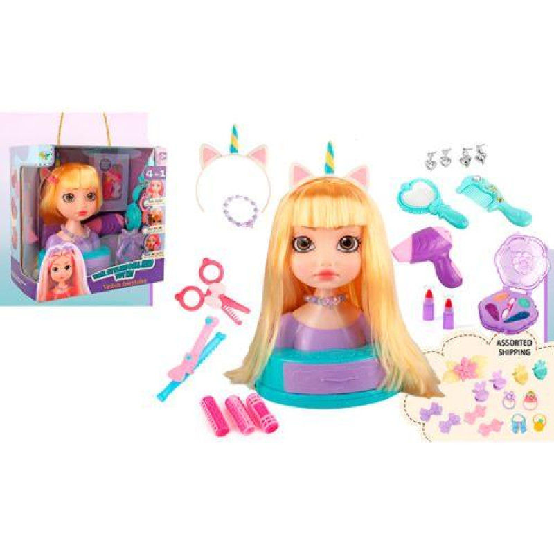 Лялька голова для зачісок 23см, тіні, помада 2шт, набір перукаря, аксесуари, плойка,ножиці, фен, гребінець, дзеркало, в кор. 28*28*16,5см арт: SR001