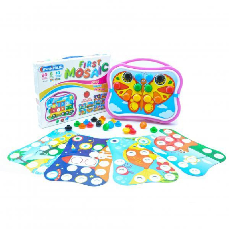 Мозаїка дитяча - захоплююча іграшка, яка пробуджує уяву, тренує просторове мислення, знайомить із геометричними фігурами, розмірами, квітами. Такі забави мультифункціональні: допомагають малюкам розвиватися, навчають та розважають. Набір "Перша мозаїка" 30 великих фішок, 10 яскравих картинок, ТМ MAX..