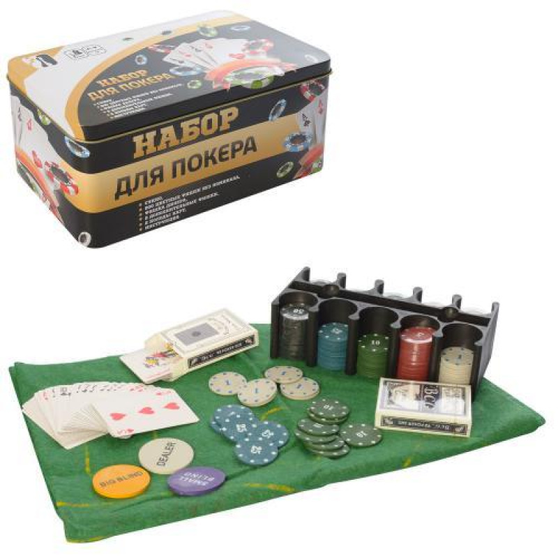 Настільна гра покер, 200 фішок (з номін), карти 2 колоди, сукно, в мет. кор. 24,5*11*12см