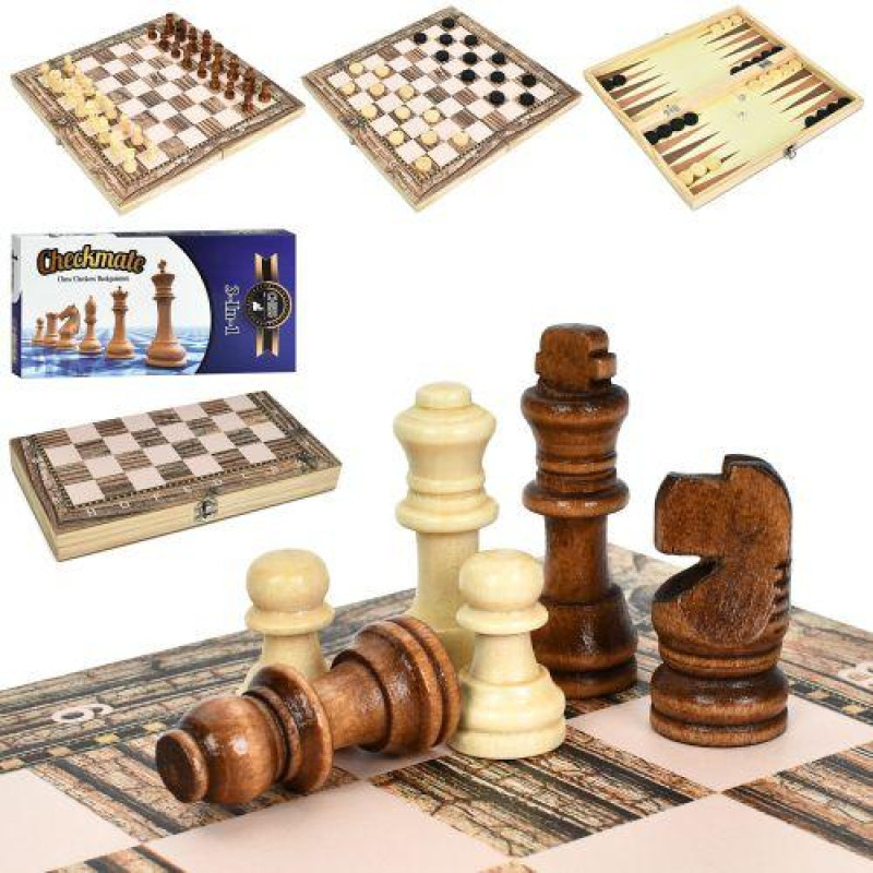 Настільна гра 3 в 1 включає шахи, шашки та нарди і стане відмінним варіантом для сімейного дозвілля. Набір виконаний з дерева в трьох відтінках і підходить як для домашніх ігор, так і для подорожей. Фігури гладко відполіровані та ретельно виточені, що робить гру приємною та зручною для дітей і дорос..