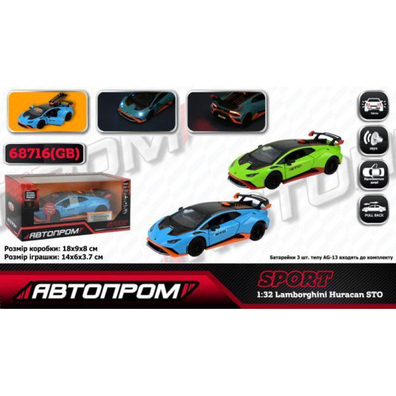 Машина мет. АВТОПРОМ 1:32 "Lamborghini STO", бат, світ., звук, відкр.двері, в кор. 18*9*8см арт: 68716AG