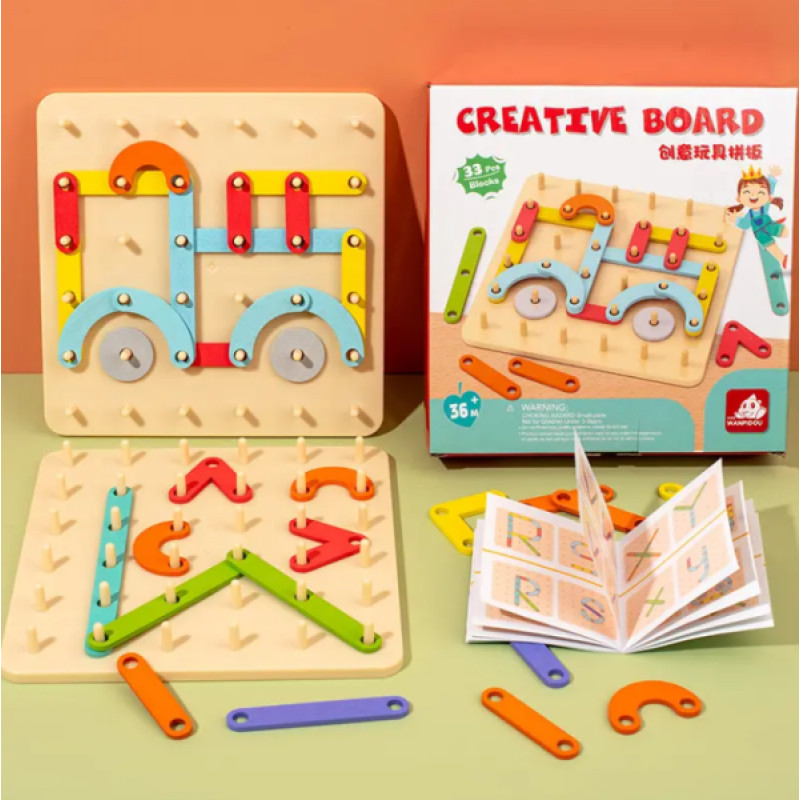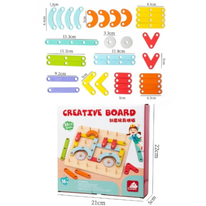 "Creative Board" – це розвиваюча іграшка для дітей від 3 років, яка допомагає розвивати дрібну моторику, логічне мислення, уяву та координацію рухів. У комплект входять різнокольорові дерев'яні деталі різних форм і розмірів, які можна закріплювати на основі за допомогою дерев'яних штифтів. Використовуючи зручну книгу, яка йде в комплекті - дитина може складати різні фігури, літери, цифри, тварин, транспорт та багато іншого. Також можна вигадувати власні унікальні конструкції.
