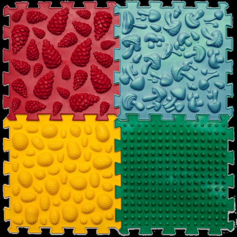 Масажний килимок складається з 4 пазлів, виробляється з гігієнічного, гіпоалергенного матеріалу на основі ПВХ.