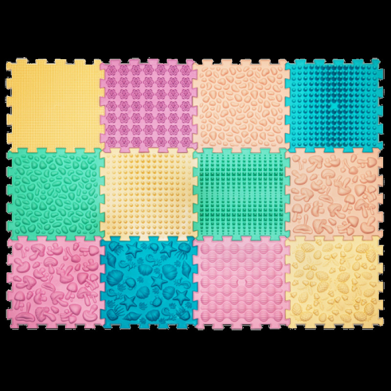 Масажний килимок складається з 12 пазлів і виготовлений із гігієнічного, гіпоалергенного матеріалу на основі ПВХ.