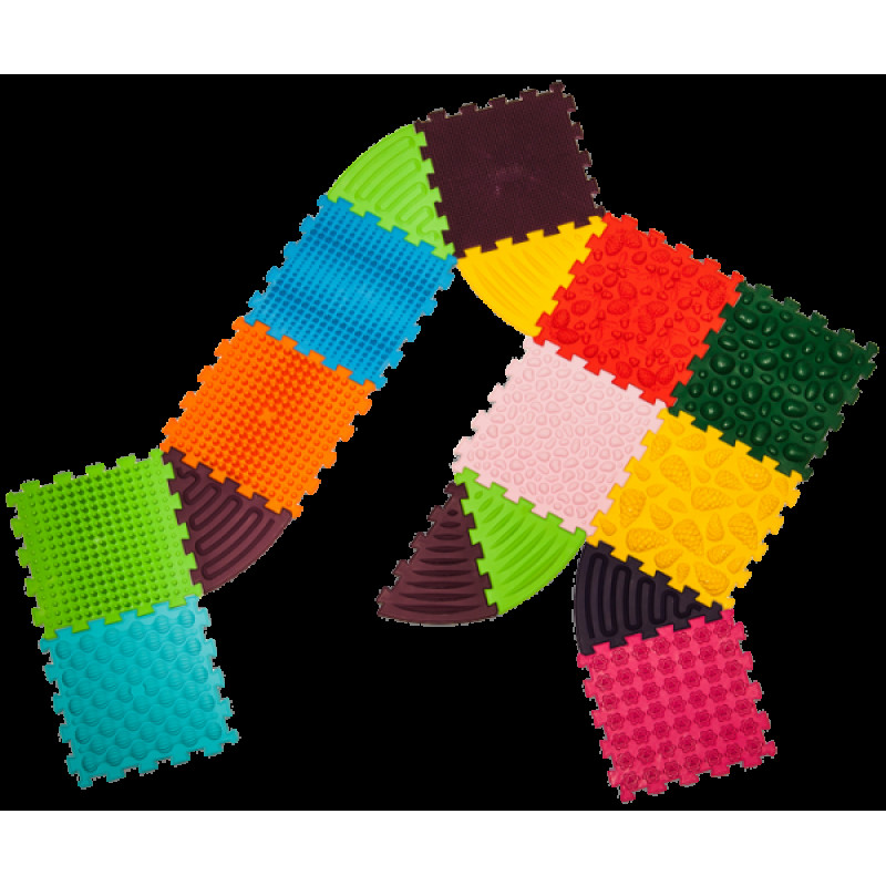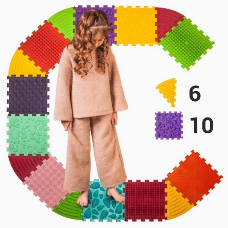 Усі пазли виробляються з одного матеріалу – безпечного, гіпоалергенного ПВХ без шкідливих домішок. Але завдяки різним текстурам відчуваються по-різному. Травка, мушлі, галька, гриби відносяться до більш м'яких пазлів. Вежі, Їжачки, Морські, Жолуді – до середніх. Піраміда, Шипи, Лотос, Шишки відносяться до більш твердих пазлів. Вплив поверхонь різної твердості надає найкращий ефект для масажу, тренування стоп та сенсорної інтеграції.