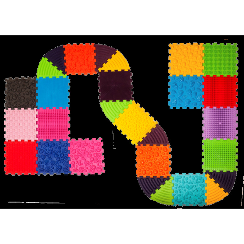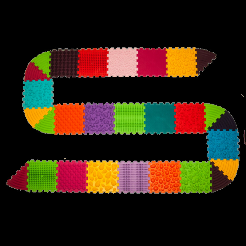 Набори із трикутними поворотними пазлами дозволяють створювати хвилясті доріжки, круги, візерунки, перетину. Таким чином ви зможете створювати маршрути навколо предметів меблів, кутів, економити місце в кімнаті, а головне – стимулювати фантазію та інтерес дітей до занять на килимках.