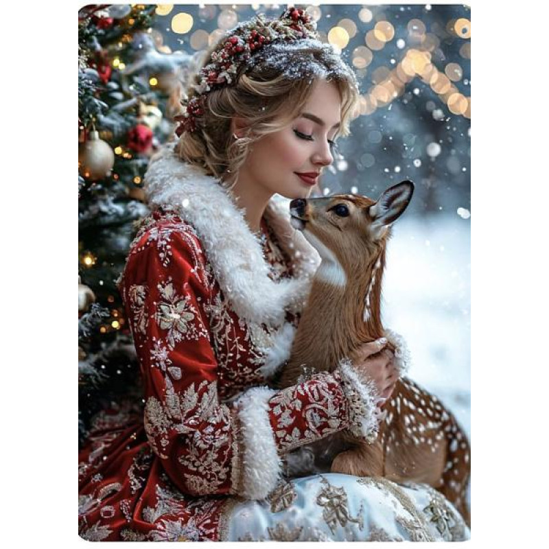 Алмазна мозаїка «Різдвяна Муза» — витончений та атмосферний набір для творчості, який передає магію зимових свят і теплоту щирих почуттів. На картині зображена молода жінка у розкішному різдвяному вбранні з вишуканими візерунками, яка ніжно притискає до себе маленьке оленятко. Навколо — засніжений п..