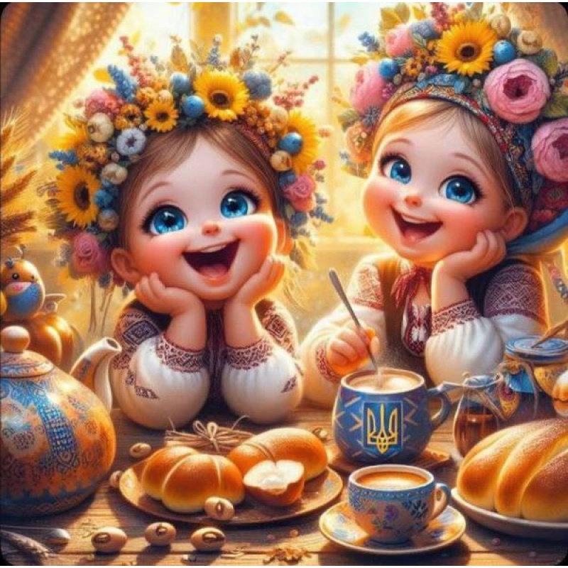 Алмазна мозаїка «Щасливі українські дівчатка» – це весела картина, де дві українські дівчинки зустрілися на чаюванні з булочками і медом. Обидві мають віночки з квітів та гарні вишиванки, вони усміхнені та радісні, створюючи атмосферу дружби та щастя.Принцип роботи простий: відкрийте полотно та розк..