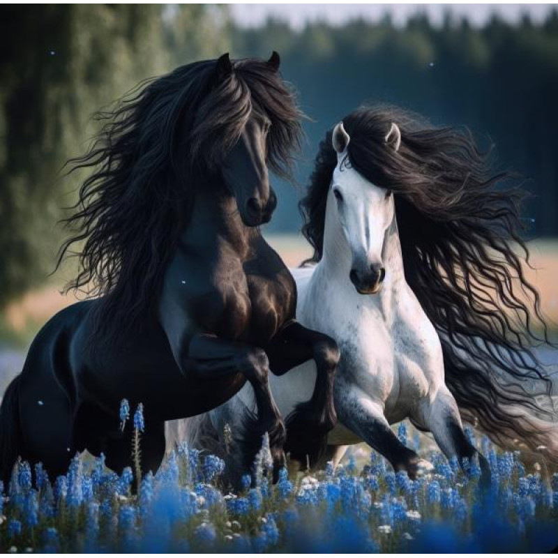Алмазна мозаїка «Пара скакунів» – це яскрава композиція, на якій зображена пара величних коней — чорний та білий, що стрімко мчать полем, прикрашеним квітами. Їхні довгі хвилюючі гриви розвіває вітер, підкреслюючи силу, свободу та красу цих тварин. Сюжет випромінює гармонію протилежностей і водночас..