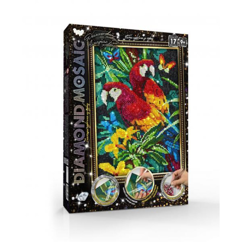 Набір для творчості вишивка камінням Алмазна мозаїка Diamond mosaic Птахи. Папуги, 20х30см, Danko Toys (DM-03-09). Комплектація: картина-схема; комплект різнокольорових страз; пінцет; олівець аплікатор; точила; багетна рамка; інструкція. Тип каміння: кругле. Закладка: Повна. Особливості: . Кількість кольорів: . Упаковка: В коробці. Країна-виробник товару: Україна