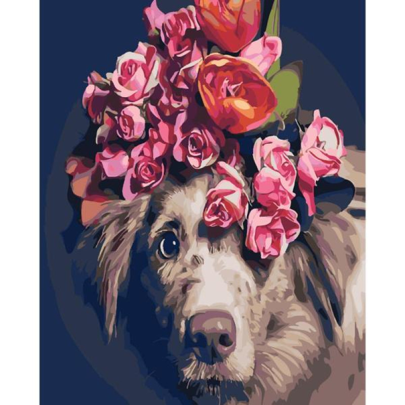 Картина за номерами Тварини. Мордочка з квітами, 40х50см, , з лаком і рівнем, в термопакеті, Strateg (SY6344-mt)