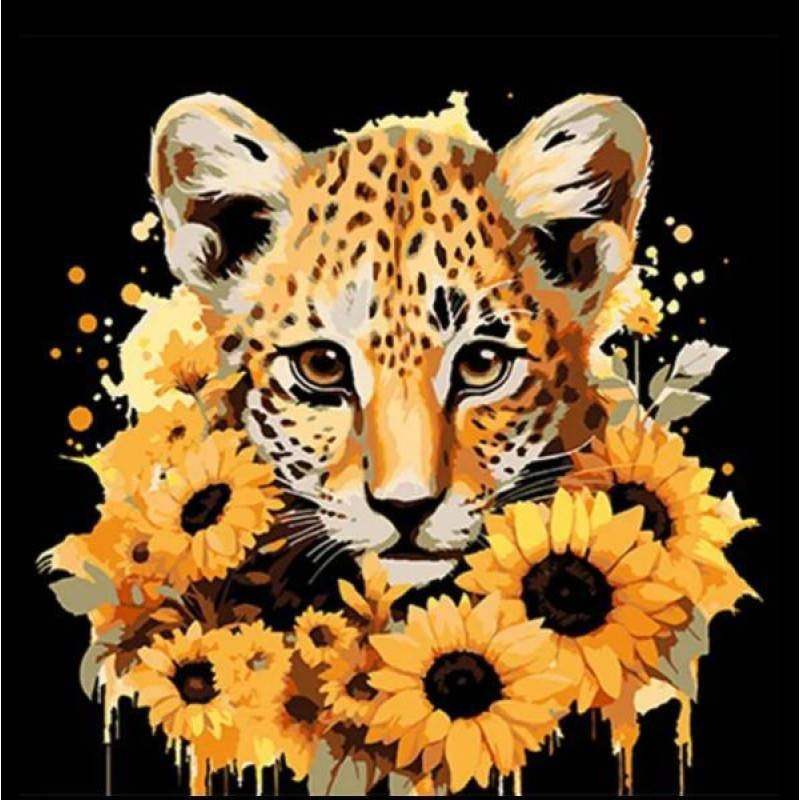 Картина за номерами Тварини. Леопард та золоті соняшники, чорний фон, 30х30см, в термопакеті, Strateg (SH3030-21-mt)